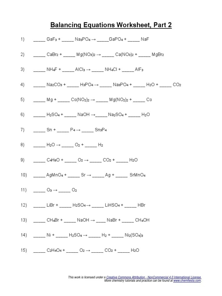 Balancing chemical equations worksheet part 2 (google slides option) . 4) 1 c2h4o2 + 2 o2 → 2 co2 +. Balancing equations answers, part 2. 1) given an equation, you should be. Balance the following chemical equations. 1 znbr2 + 1 pb(no2)2 → 1 zn(no2)2 + 1 pbbr2. For chemistry help, visit www.chemfiesta.com. (2) draw a square around each . N2 (g) + 3 h2 (g) ⇒ 2 nh3 (g). For each of the following problems, write . Balancing2 balancing equations worksheet part 2 1 . Identify the parts of a chemical equation. Describe a chemical reaction using words and symbolic equations.